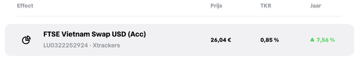 The choice to invest in Vietnamese stocks is limited at Trade Republic. The FTSE Vietnam Swap USD is the only ETF on offer. This tracker is a swap-based or synthetic ETF and, in a nutshell, uses derivatives such as swaps to replicate the performance of an underlying index, in this case the FTSE Vietnam index. The reason issuer Xtrackers uses this is because the Vietnam stock market is difficult to access. The counterparty risk of this tracker is spread across three institutions Barclays Bank, Goldman Sachs and HSBC Bank.