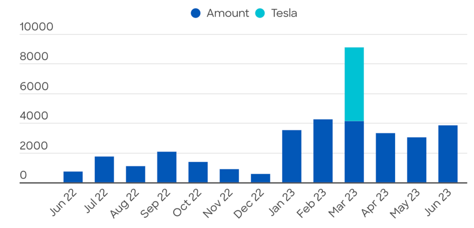 Geographically, Mexico is in an excellent position as it has a 3145km border with its big neighbour. And on top of that, the country has quite a lot to offer such as rich resources (oil and agricultural products) and cheap labour, allowing for low production costs. In 2022, the US accounted for 56% of all foreign investment and in 2023, US investment gained additional momentum (see below, US investment in Mexico on a monthly basis), thanks in part to Tesla investing USD 5 billion in a new ‘gigafactory’. And since mid-2023, even more US money has been flowing to Mexico than to China, and for the first time in living memory. Mexico is the US’ main trading partner and ‘made in Mexico’ is the new ‘made in China’.