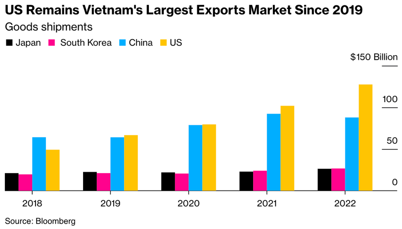 No wonder Vietnam has since risen to become the 8th most important trading partner of the US. And for Vietnam, the US has been the most important export market since 2019 (see below), while exports to China are on a downward trend. These statistics clearly show where the country’s priority lies today although a recent visit to the country by Chinese President Xi shows that the race is not over yet. Quartons, including HSBC, even claim that many new Vietnamese exports are Chinese products that have only been rebranded.