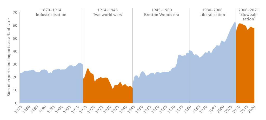 Globalisation, broadly defined as the increasing integration of the global economy through trade, capital and migration flows, has been a significant driver of economic growth for over four decades, particularly for developing economies. But globalisation’s rise has never been a linear process. As the chart below shows, it has progressed in fits and starts since the late 19th century but went into reverse during the two world wars and the Great Depression that started in 1929.