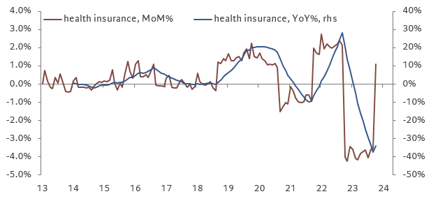 Chart 6: Health insurance went from a drag to a boost, and is likely to stay positive in the next six months