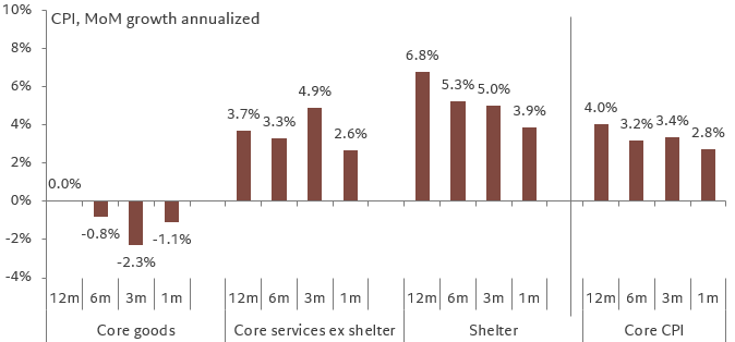 Looking at the details, current disinflation continues to be driven primarily by goods and housing, but supercore services inflation slowed as well. Core goods prices fell 0.1%MoM as used vehicle prices continued to decline (albeit at a slower rate). Shelter inflation decelerated sharply after an unexpected bump last month, with both rent and owners’ equivalent rent growth decelerating.