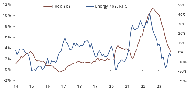 Core CPI came in weaker than consensus expectation, increasing 0.227% MoM (consensus: 0.3%). This is a step down from its 0.32% MoM print last month. The YoY reading fell further to 4.0% from 4.1%. Core inflation is headed in the right direction, as the 3m annualized growth rate is even lower at 3.4%.