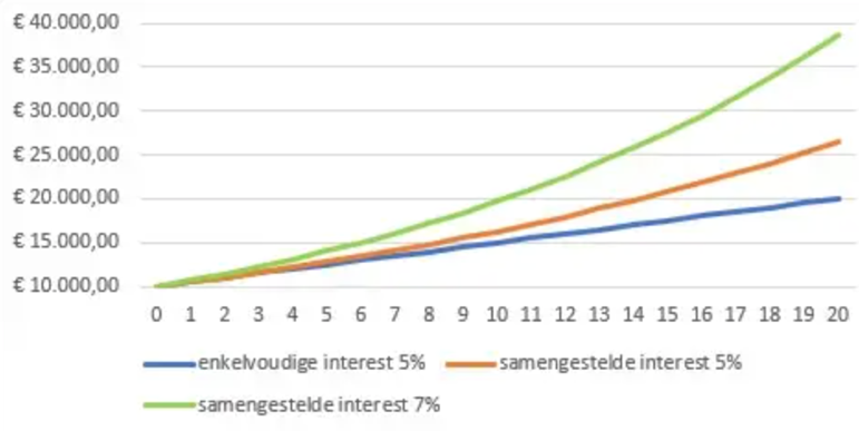 Dans le cas de la version par capitalisation, rien n’est versé et les revenus sont automatiquement investis dans l’indice suivi. Le grand avantage est que le principe de l’intérêt composé s’applique à ce tracker, c’est-à-dire le rendement sur le rendement. Toutefois, en tant qu’investisseur, vous devez attendre plus longtemps pour voir les fruits supplémentaires de cet investissement, surtout si vous avez un horizon de placement de 5 à 10 ans. Comme vous pouvez le voir dans l’illustration, à partir de la dixième année, la différence entre l’intérêt composé et l’intérêt simple commence à augmenter considérablement, et la différence entre 5 et 7 % par an n’est pas non plus à sous-estimer à long terme.