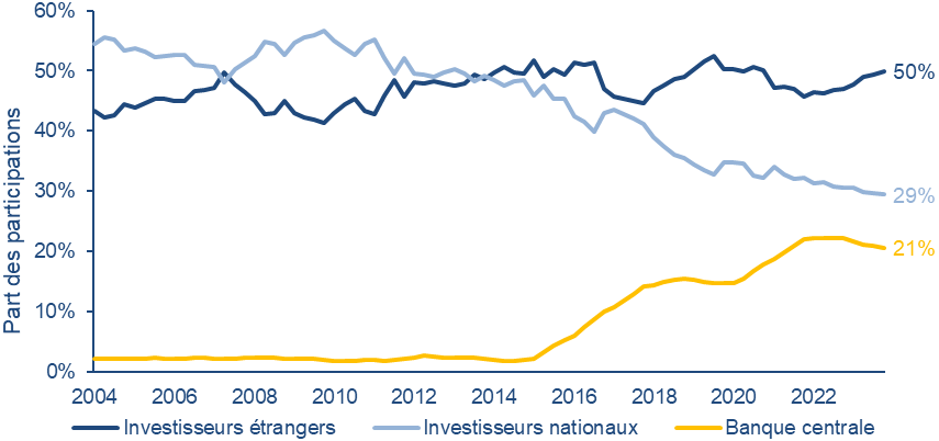 Figure 1 : La France a un pourcentage élevé d’investisseurs étrangers dans sa dette publique (% du total)